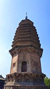 到达代县后,基地班师生首先参观了位于县政府的阿育王塔和毛主席路居纪念馆。阿育王塔始建于隋仁寿元年(601年),自建600多年中历遭三劫,于元至元十二年(1275年)改建为砖塔。阿育王塔为圆锥体佛教藏式造型,塔基平面为长方形,塔建于塔基正中央 该塔结构圆润美观,砖雕艺术高超,令同学们惊艳不已。