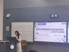 陈映涵团队:《近现代闽南骑楼文化的发展历程 ――――以泉州中心区骑楼为例》,该团队通过线上线下相结合的方式开展调研,并在线上和线下同时发放调查问卷,在此基础上,进一步深化了对泉州骑楼建筑文化的认知,并对骑楼文化的传承与发展提出自己的见解和对策,最终以论文的形式作专题汇报。
