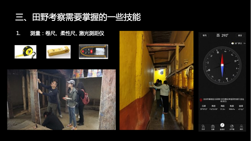 魏文老师也分享了田野考察需要具备的一些技能和注意事项,包括测量、画图和记录、用电脑软件绘图、拍照以及整理图片的方法等。