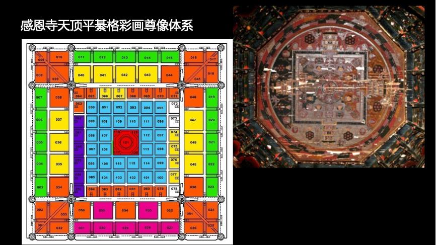 首先列举的是红城子镇鲁土司家族的属寺感恩寺。此寺为五到七世鲁土司三代人于15世纪末到16世纪初兴建,目前保存下来较为完整始建时期风貌。考察队运用艺术史考察标准化的工作方法对寺内的建筑、壁画和雕塑进行了测量、绘图和拍照。对主殿大雄宝殿天顶彩画的考察和分析揭示出天顶平棋彩画的布局及其反映的宗教思想是整个汉式大木构建筑设计的基础。其平面布局吸收了来自卫藏15世纪初所开创的白居寺吉祥多门塔“万神殿式”做法,利用平棊和斗八藻井进行巧妙的规划和设计,绘制出四部密续各类曼荼罗、尊神图像,按照由高向低的次第,由中心向外依次排布,最终在天顶组成一个完备的佛教神系,创造出一种即遵循汉地建筑文化传统,又具象化地体现藏传佛教密教思想的神圣空间。