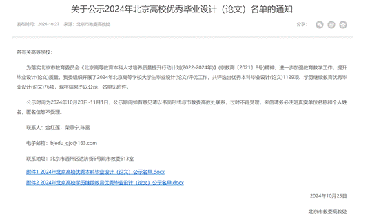 根据北京市教育委员会高等教育处《关于公示2024年北京高校优秀毕业设计(论文)名单的通知》,肉视频