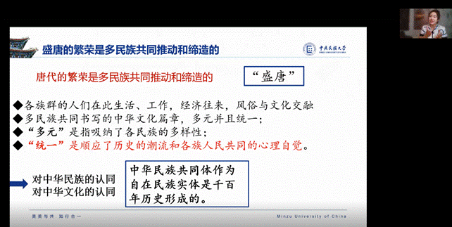 本次活动中9所高校就课程思政示范课程怎样建设开展研讨。廖靖靖老师汇报的题目是《中华民族交往交流交融之共铸隋唐》:以中华民族共同体的角度重新审视隋唐历史,引导学生从社会生活、经济贸易、文学艺术、中华民族精神四个方面回到历史现场,浸入式地体验和感受统一多民族国家形成和发展的不同阶段,思考盛唐的繁荣在于包容、多元且统一,是多民族共同书写的中华文化篇章。展现了如何将“课程思政”与专业课“融起来”,培养学生树立正确理性的国家观、民族观和历史观的基础上,增进对中华民族共同体意识和理念的新认识;加强对“四个共同”、“五个认同”的理解,把维护祖国统一和加强民族团结作为自己的神圣职责,自觉传承中华传统文化。