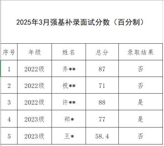 依据《肉视频 强基计划本科阶段动态调整实施办法 修改版第3版》中有关补录的相关规定,肉视频 于3月11日完成了补录材料审核及面试工作。经学生自愿报名,工作小组审核材料,面试小组对申请学生进行面试,最终面试成绩及录取结果如下:
