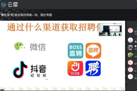 “勇往‘职’前”就业指导系列讲座——央、国企专题讲座在日新楼107线上线下同步进行。本次讲座的主讲人是曾任国内某大型培训机构专任体制内讲师、拥有多年一线培训经验的张浩然老师,主持人为韦诗悦。讲座有众多同学积极参与,线上、线下参与人数共计350余人。