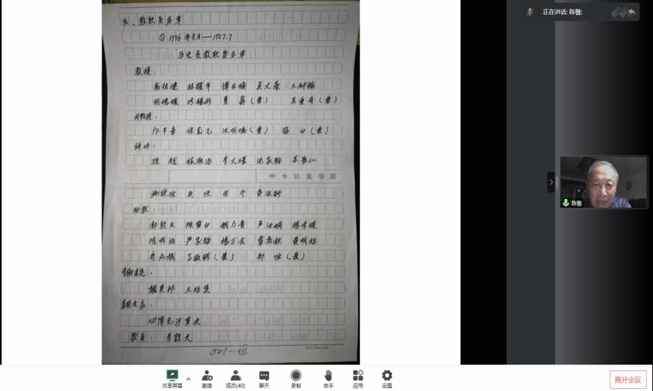关心下一代委员会副主任陈暋老师为2022级新生党支部开展了“七十一年民大风雨历程,六十六载史院蓬勃发展”的专题党课。本次党课采用腾讯会议线上方式进行,2022级学生党支部党员及部分入党积极分子参加了学习。