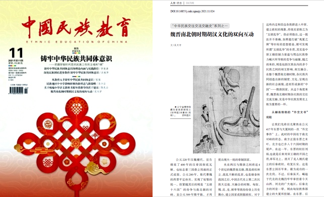 吴天宇博士撰写的《魏晋南北朝时期胡汉文化的双向互动》(2021年第11期),主要关注魏晋南北朝时期汉族与胡族在文化、制度方面的双向互动。一方面,十六国北朝的君主如刘渊、慕容儁、苻坚等人,皆重视对汉文化的学习与吸收,同时大力崇尚儒学、提倡文教,呈现出“僭伪诸君有文学”的历史现象,这促进了胡族政权的部族传统向汉晋以来王朝制度的转变。另一方面,匈奴、羯、氐、羌、鲜卑等不同族群在进入中原后,与汉人交流、融合,也为中原文化注入了新的活力与精神。正如陈寅恪所言,“塞外野蛮精悍之血注入中原文化颓废之躯”,使其新机重启,扩大恢张,开创空前之世局。北朝胡族传统束缚小、守旧意识淡,文化制度实际上更具开放性和活力,对于隋唐帝国影响深远。由此可以看出,“我们灿烂的文化是各民族共同创造的”。