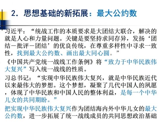 杜玉芳教授指出,新时代统一战线迎来了两个方面的变化:一是战略地位的新提升,党的二十大报告指出人心是最大的政治,统一战线是凝聚人心、汇聚力量的强大法宝。习近平总书记站在党和人民事业成败的高度,深刻揭示了统一战线与国家兴衰和政权安危的内在联系阐明了统一战线不是简单的执政之术而是内在领导之道、治理之道;二是思想基础的新拓展,杜玉芳教授以乔羽的《我的祖国》为例,说明统战工作要找到最大公约数,才能画出最大的同心圆。杜教授指出,把实现中华民族伟大复兴作为团结海内外中华儿女的最大公约数,进一步拓展了统一战线成员的共同思想政治基础。