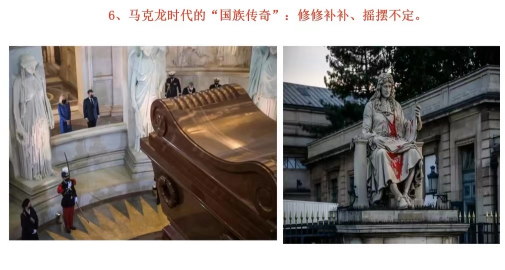 国族传奇的争论一直争论到现代,时至当下的马克龙时代,国族传奇的特点是修修补补、摇摆不定。作为中间派的马克龙,试图通过历史研究,修复和曾经被殖民地国家的关系,但又纪念推动殖民的历史人物。马克龙既要考虑到长期以来的历史论述,又要顾及到基于性别、种族对颠覆历史叙述的需求。由于历史人物多面性,如何处理这些人物来减少过多的政治性,达到合理的遗忘,这需要一种政治智慧。而马克龙这种修修补补的方法,就目前看来,是为整个国家负责的一种比较合理的处理方式。