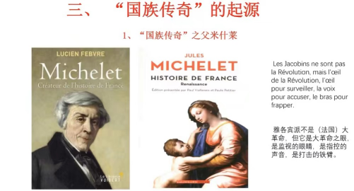 在第三部分中,杨光老师向我们讲述了国族传奇的起源,重点探讨了有关米什莱的相关信息。米什莱被学术界誉为“法国最早和最伟大的民族主义和浪漫主义历史学家”,是法国“国族传奇”之父,他在法国政局变化频繁的背景下提出了“国族传奇”的概念,为法国的历史叙事作出了重要贡献。米什莱撰写的历史是以国族为中心而非以国王中心的历史,强调法国人民是法国真正主人。但是这种历史叙述代表着上升的资产阶级的要求,导致法国后续历史学家在历史叙述中带有强烈“服务于当下”的目的性。除此之外,“历史小说”的流行,也对国族传奇历史概念流行起推动作用。