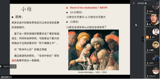作为讲座内容的总结,李老师认为全球中世纪是有益但不够强大的理论工具。我们在具体论述中应自觉意识到它带有近代以来全球史叙事的深刻烙印。这一新兴的研究领域涉及多个地域、语言、时间及学科,对研究者的要求过高。要真正突破欧洲中心论,我们应通过具体研究逐步开拓一条新路,增加说服力。