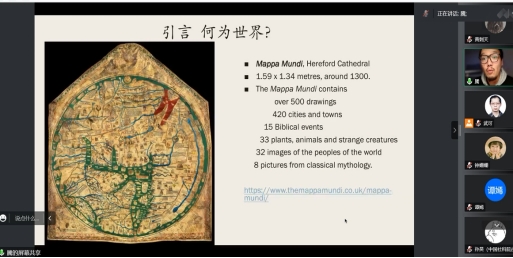 李老师用“何为世界”这一问题拉开本场讲座的序幕。他以两张14世纪的地图——一张是1300年左右英国的“世界之布”,一张是1389年的大明混一图——为切入点,说明地图在全球中世纪研究中的重要性,主张我们应关注思想文化上的跨边界互动与交流。