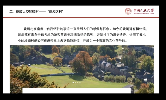 讲座的第二部分主要是“‘瘟疫之村’——伦敦大疫的辐射”,在这部分中,赵教授为我们详细地讲解了瘟疫之村的情况,也展现了更多伦敦市民的情感。赵教授告诉大家,瘟疫之村并不是耻辱的名字,相反,它闪烁着人性的光辉,体现了一种道德的束缚。